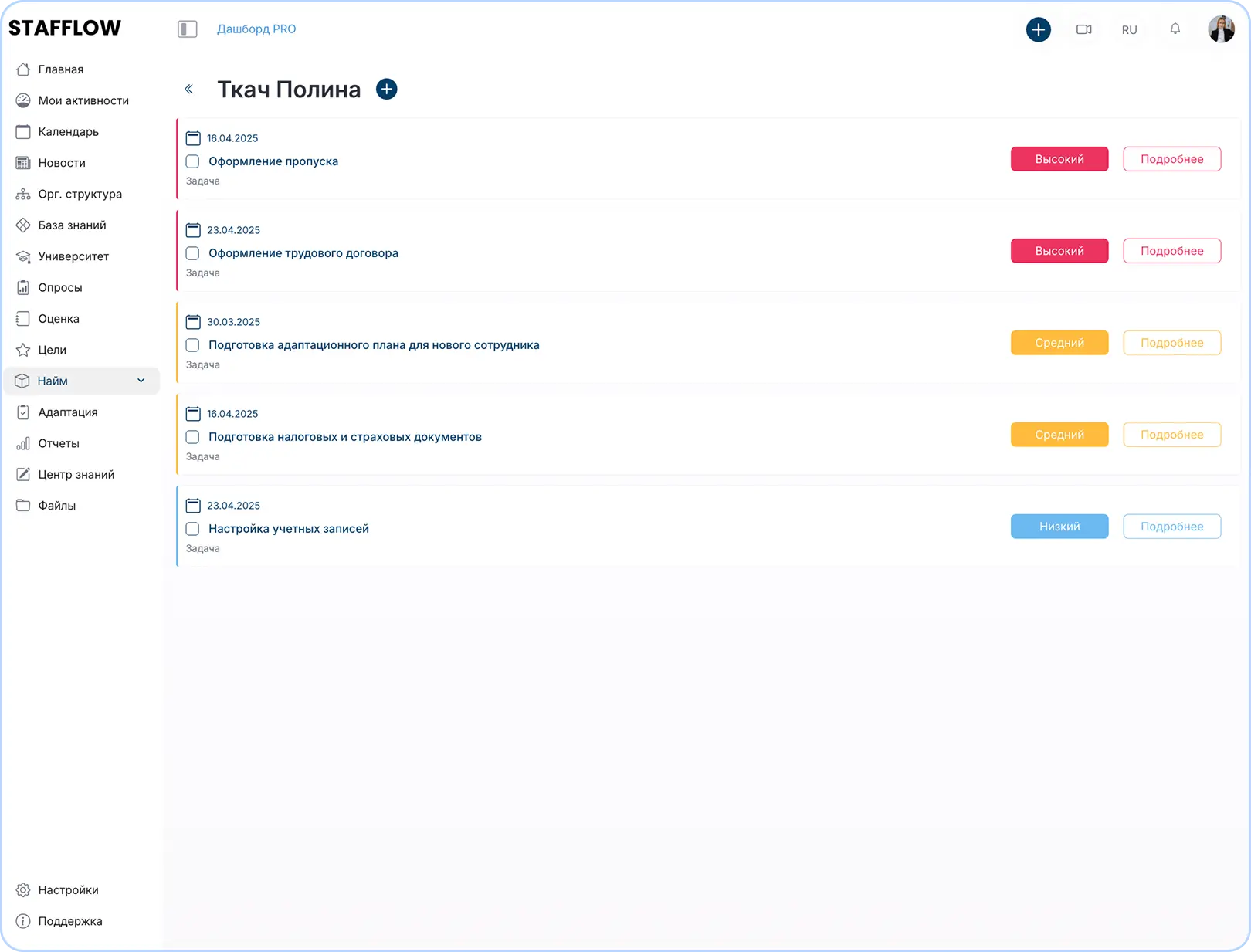 Автоматическое создание задач – система распределяет задачи по IT-настройке, доступам и документам между ответственными