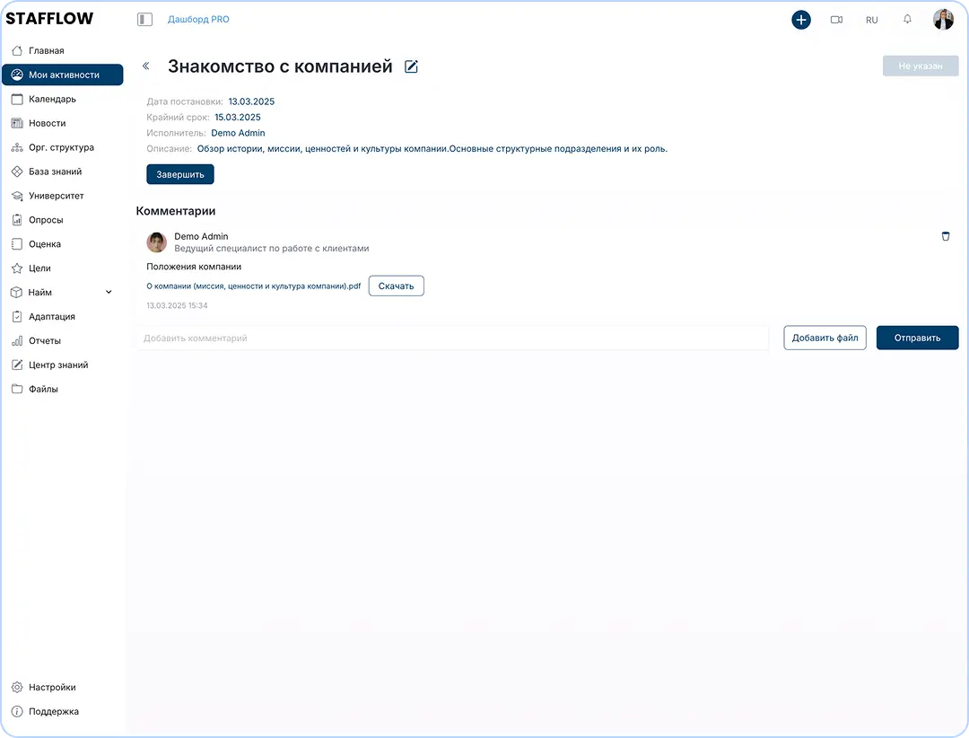 - быстрое вхождение новых сотрудников через пребординг и задачи адаптации