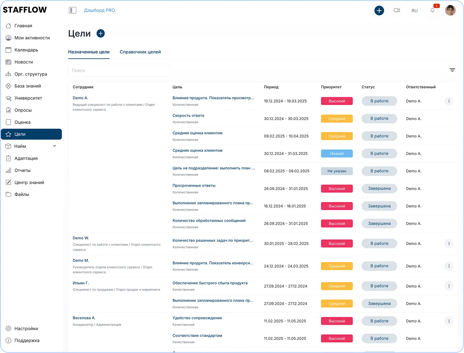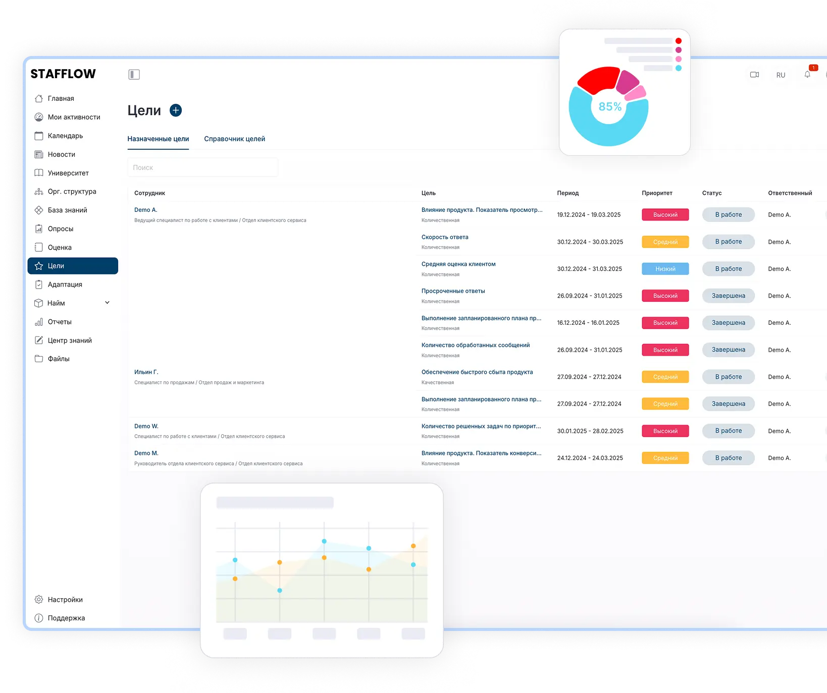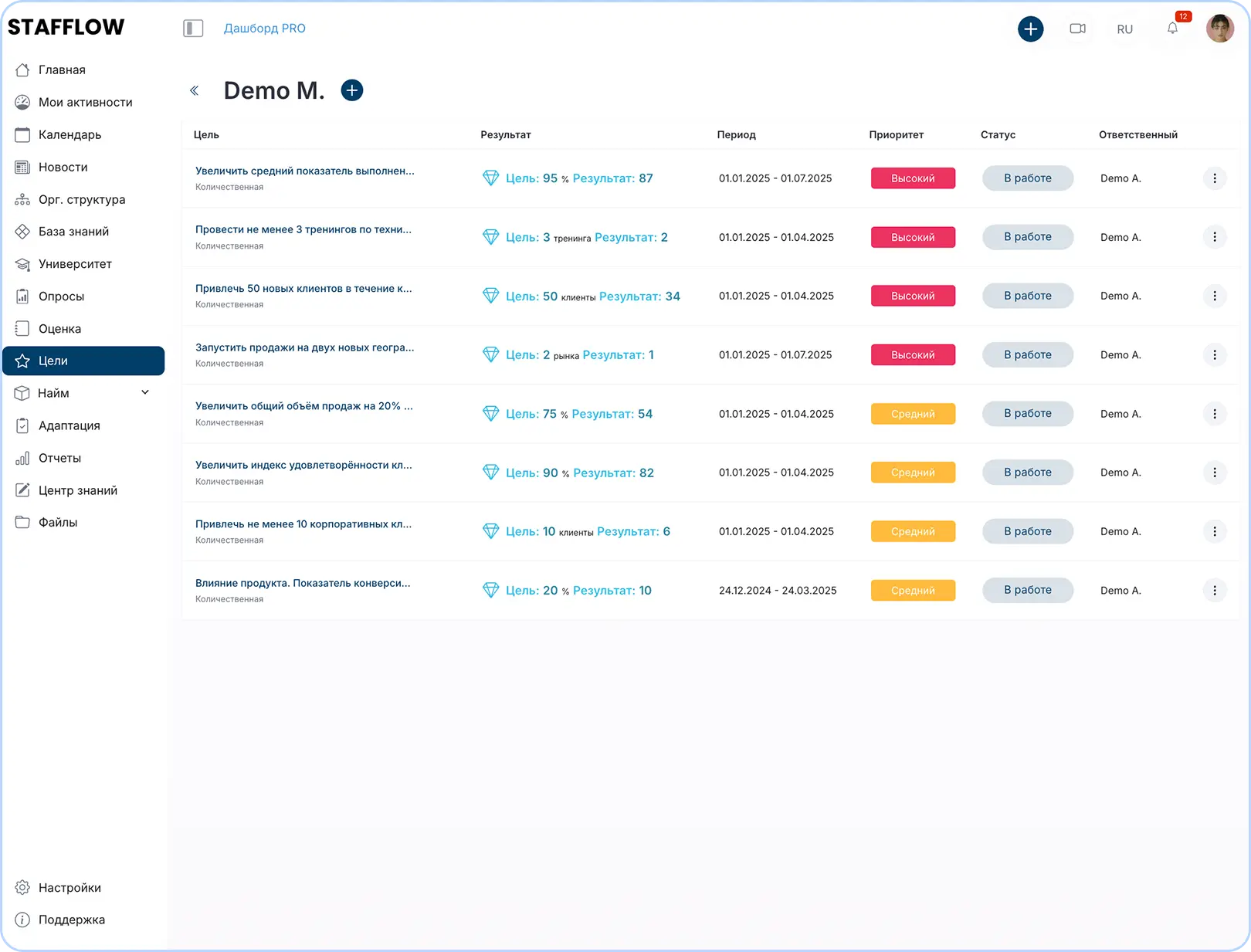 Автоматическое обновление статусов – система автоматически фиксирует изменения в целях и результатах