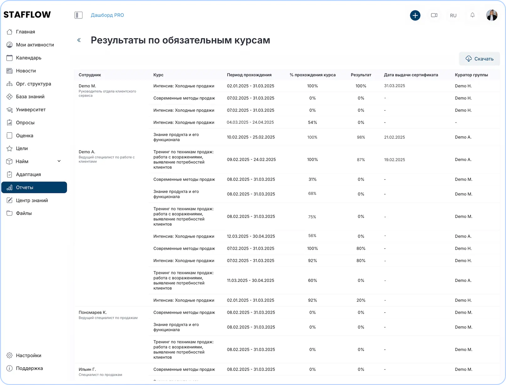 Мощный инструмент, который объединяет данные по рекрутингу, обучению, оценке, опросам и целям в готовые отчёты