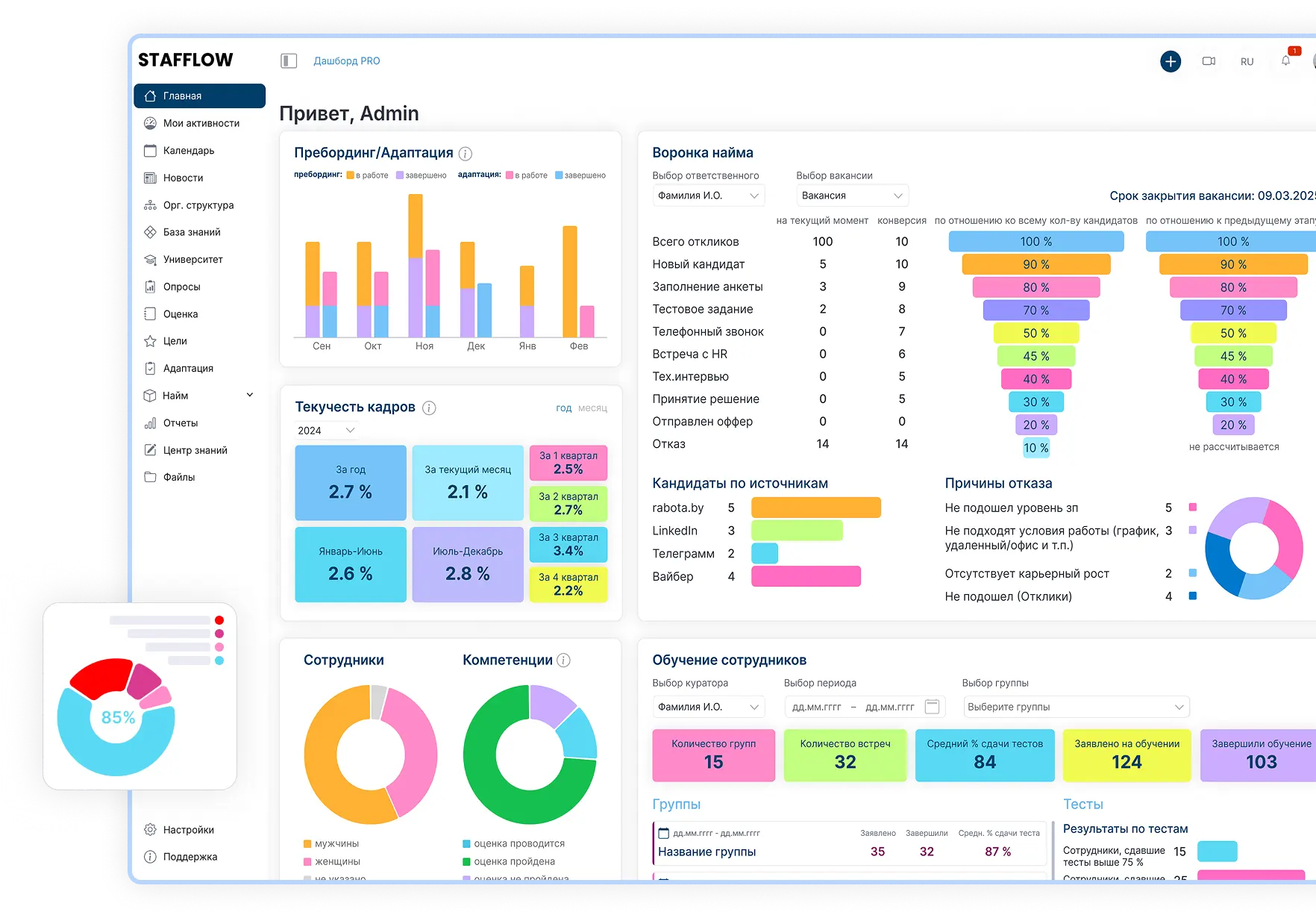 Удобная панель управления, где собраны ключевые HR-метрики вашей компании
